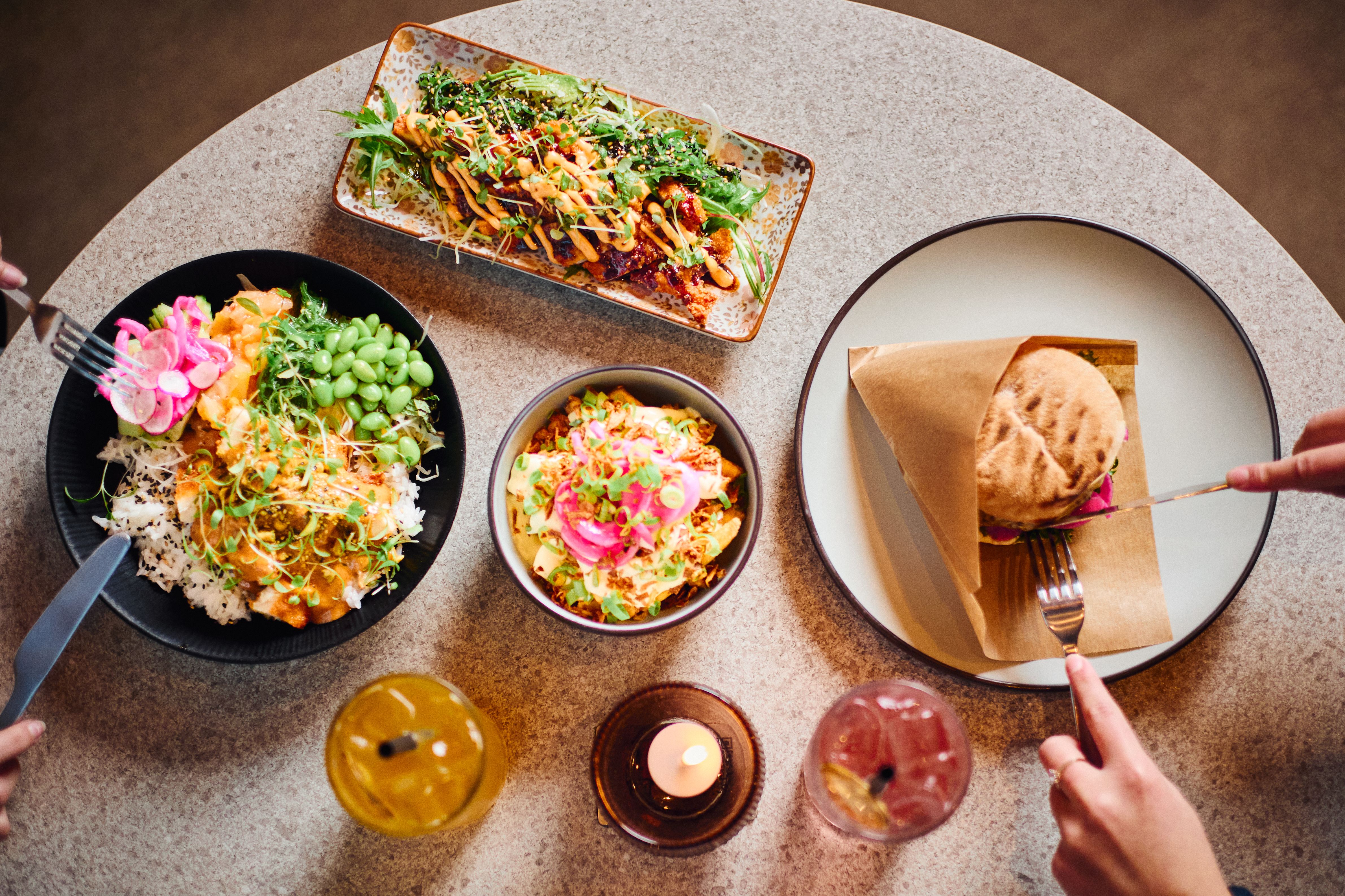 I den moderne og lune restauranten kan du nyte burger, asiatiske bowls eller dele smakfulle småretter på bordet.